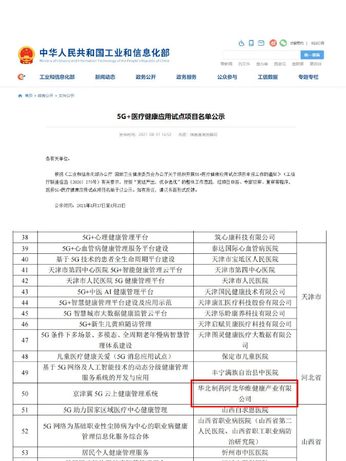 2021年8月17日-23日,國家工信部網(wǎng)站發(fā)布“5G+醫(yī)療健康應(yīng)用試點(diǎn)項(xiàng)目名單公示”目錄,華維公司“5G云上健康項(xiàng)目”成為首批國家試點(diǎn)項(xiàng)目,也是河北省唯一一家入圍企業(yè)單位。